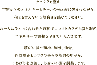 宇宙美容セルルラはエネルギー(気)を整え、入れ替えることで心身の状態を整える美容です。健康で美しく、幸せへと導く施術です。
